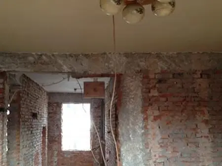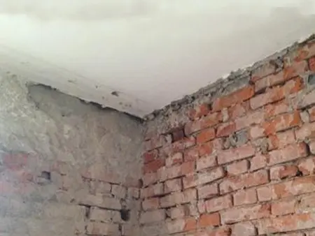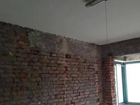 这是次卧和厨房间的24内墙,去楼上邻人家看了一下,从头砌一个墙,放弃了。显露了红砖和圈梁还有楼板,把墙皮铲掉当前发觉。